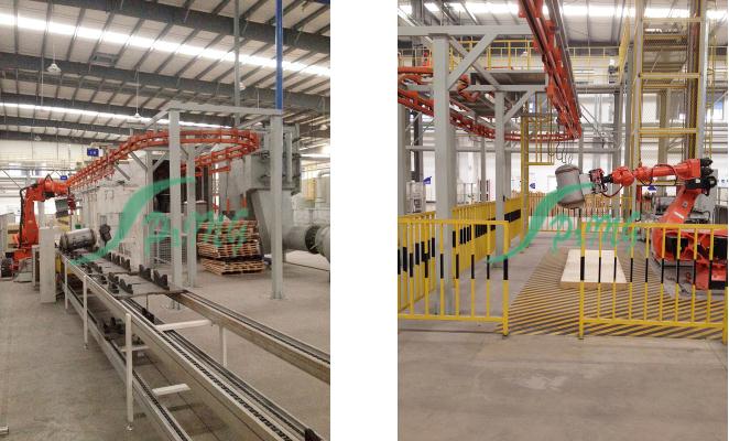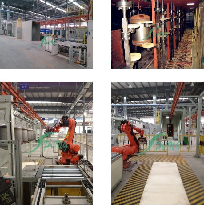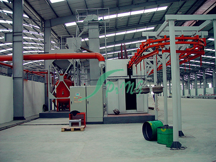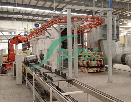 (1)處理方式為通過(guò)式全自動(dòng)方式:采用先進(jìn)的封閉軌積放輸送鏈,特別適用于大批量自動(dòng)化生產(chǎn),可實(shí)現(xiàn)生產(chǎn)運(yùn)輸?shù)某绦蚧妥詣?dòng)化,最多可同時(shí)噴砂處理8個(gè)內(nèi)膽。