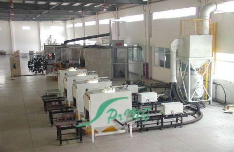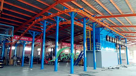 (2)分區(qū)化設(shè)計(jì):按照1把或者2把噴槍一組分區(qū),除共用噴砂箱、輸送鏈和除塵系統(tǒng)外,其余完全獨(dú)立。當(dāng)每把(套)噴槍的相關(guān)設(shè)備出現(xiàn)故障,則可以關(guān)閉該把噴槍的使用,而不至于影響整個(gè)設(shè)備的使用。